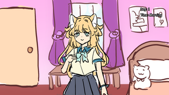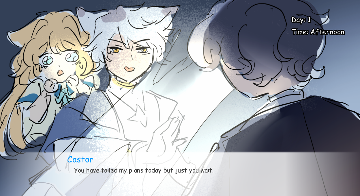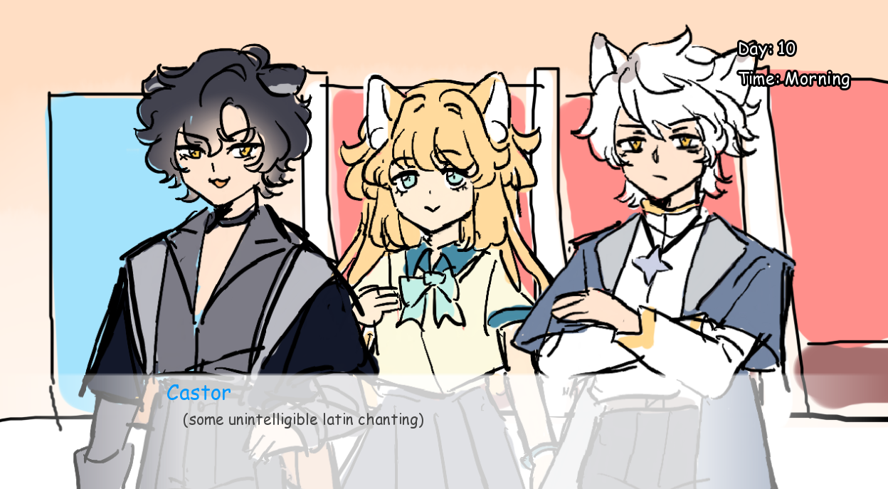 I wanted to see how quickly I could make a VN, so I made this game in all of three days including the graphics. I honestly didn’t even intentionally try to draw badly, this is just what my placeholder assets look like (with the exception of the title screen). I also tried to compose music for this game but it was so bad it genuinely made the game unplayable, so I had to use some royalty-free music. The soundtrack is the only redeeming aspect of this game.